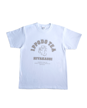 ひやかしIPPODOTEAのメインキャラクター湯気のお化け「ひやかしちゃん」をあしらったTシャツ。ちょっとレトロで懐かしい感じもするカレッジトレーナー風デザインにお化けのひやかしちゃんがちゃっかり潜みます。目指した温度感はONもOFFもどちらもOK!『おとなの普段着』。だからこそ、派手にポップになりすぎないようにプリント色は落ち着いたライトグレー。例えば、ひやかしTシャツの上に夏らしい麻のジャケットや薄手コートを羽織る、脱いだら正面にニッコリひやかしちゃん。唸ってしまうほどカッコよい、大人のひやかしです。